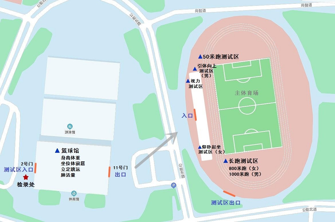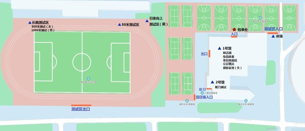②津南主体育场:一分钟仰卧起坐(女,看台下击剑室)、视力(看台下体测室)、引体向上(男)、1000米(男)/800米(女)、50米。