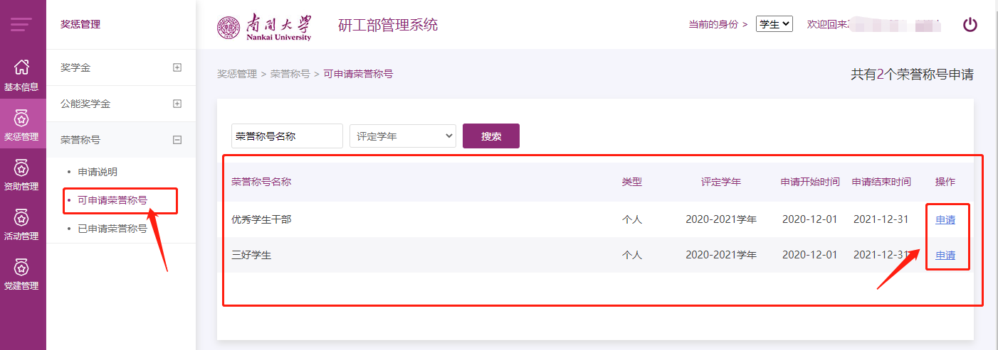 本年度荣誉称号和奖学金申请流程相互独立,学生不需要提交个人信息也可以申请荣誉称号。9月9日起,请学生在奖惩管理模块下的荣誉称号菜单,可点击选择可申请的荣誉称号,选择相应的荣誉称号进行填写提交,提交后可下载打印个人申请表。
